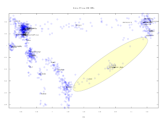 The biggest separation for both Axis is for the cluster I nicknamed Cushitic, while the Berber, Semitic and Mozabite clusters appear pretty close, with the Mozabites looking a bit isolated.