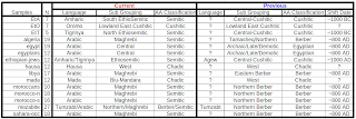 A subset of the Intra-African dataset I have includes Afrasans, or Afroasiatic speakers. Afroasiatic is typically divided into 6 major categories or groups; Semitic, Berber, Egyptian, Chadic, Cushitic and Omotic. A 7th, but nearly extinct group, known as Ongota is contentious, but is by some included as its own branch within the Afroasiatic phylum. All of these Language groups, with the exception of Semitic, are exclusively found in Africa. The 211 Afrasan samples in the dataset belong to 4 or 5 of those groups mentioned, depending on how one accounts for any language shifts (that is shifts within the wider Afrasan phylum) that might have occurred. A rough table is shown below associating the 211 samples with current, and in some cases previously spoken language or language groups of Afroasiatic.