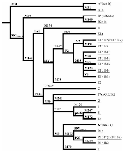 Update: With respect to R-P25 (x M269) found in the Siwa and Mozabite Berbers, there is an even more exact breakdown of the lineage in this table from another publication using the same samples as above. It shows for the Siwa Berbers, the 26.9% of R-P25 (x M269) being further resolved to 23.7 % R-V88* (x M18, V8, V35, V69) plus 3.2% R-V69 (a branch of R-V88), similarly for the Mozabite Berbers, the 3% of R-P25 (x M269) is all resolved to R-V88* (x M18, V8, V35, V69).| Phylogeny of the 29 biallelic MSY markers (in bold) tested |
