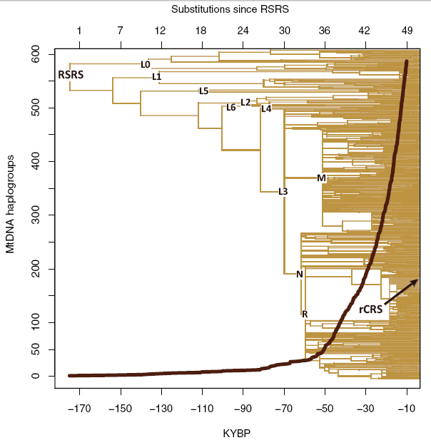 "Interestingly, the ranges of substitution counts within haplogroups M and N, which are hallmarks of the relatively recent out-of-Africa exodus of humans, are also very large. For example, within M there are two mitogenomes with 43 substitutions (in M30a and M44) and two mitogenomes with as many as 71 substitutions (in M2b1b and M7b3a). This is especially striking because the path from the RSRS to the root of M already contains 39 substitutions. Hence, the difference between the M root and its M44 descendant is only four substitutions (two in the coding region and two in the control region) as compared to 32 substitutions in the M2b1b and M7b3a mitogenomes. These observations raise the possibility that the tree in general, and haplogroup M in particular, might not adhere uniformly to the assumed molecular clock, under which substitutions occur at a fixed rate on all branches of the tree over time."